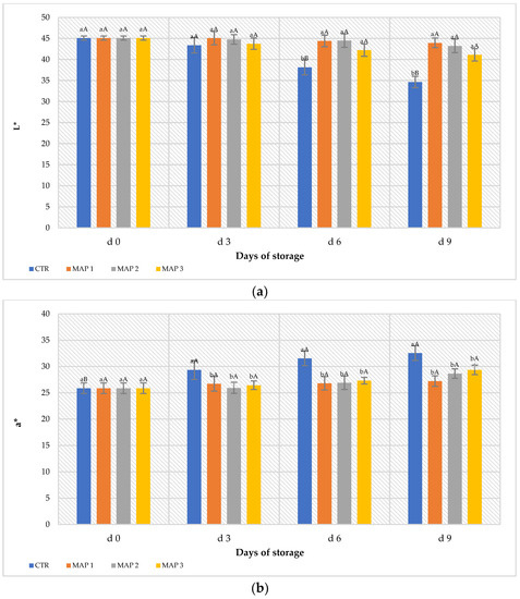 Color decay in terms of (a) L* (brightness) and (b) a* (redness) during 9 days of storage. The columns indicate the means, and the bars indicate the standard deviation (n = 5). Lowercase letters indicate significant differences (p < 0.05) between treatments on the same storage day; uppercase letters indicate significant differences (p < 0.05) for the same treatment throughout the storage period (d0 to d9).