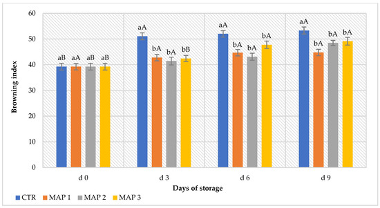 Progress of the browning state of the peel during 9 days of storage. The columns indicate the means, and the bars indicate the standard deviation (n = 5). Lowercase letters indicate significant differences (p < 0.05) between treatments on the same storage day; uppercase letters indicate significant differences (p < 0.05) for the same treatment throughout the storage period (d0 to d9).