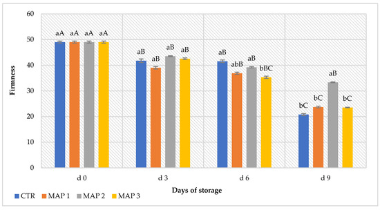 Loss of firmness of litchi fruits during 9 days of storage. The columns indicate the means, and the bars indicate the standard deviation (n = 5). Lowercase letters indicate significant differences (p < 0.05) between treatments on the same storage day; uppercase letters indicate significant differences (p < 0.05) for the same treatment throughout the storage period (d0 to d9).