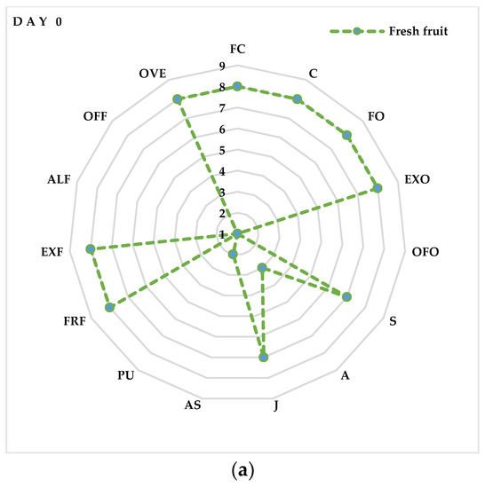 Sensory profile of litchi fruits after (a) 0 (day 0), (b) 3 (day 3), (c) 6 (day 6), (d) 9 (day 9) days of cold storage at 5 ± 1 °C and 90 ± 5% RH. The values indicate the means ± standard deviation (n = 5). Legend: flesh color (FC); firmness (C), fruity odor (FO), exotic fruit odor (EXO), off-odor (OFO), sweet (S), acid (A), juicy (J), astringent (AS), pungent (PU), fruit flavor (FRF), exotic fruit flavor (EXF), alcohol flavor (ALF), off-flavor (OFF) and overall evaluation (OVE).