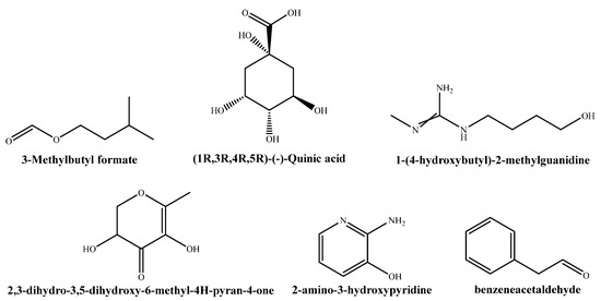 Among the fifty-three phytocompounds identified (Table 2, Figure 1 and Figure S3) in E. serrata aerial parts extract, the most abundant were: 1-butanol, 3-methyl-, formate (or 3-methylbutyl formate) (15.5%); quinic acid (14.4%), N1-(4-hydroxybutyl)-N3-methylguanidine acetate (5.3%), 2,3-dihydro-3,5-dihydroxy-6-methyl-4H-pyran-4-one (or DDMP) (4%), 2-amino-3-hydroxypyridine or 2-amino-3-pyridinol (3.9%), 4-oxohexenal (3.4%), ethyl methyl acetal acetone (3.2%), benzeneacetaldehyde (3.2%), squalene (2.7%), and hexadecanoic acid (1.9%). Among them, the assignments of (E)-4-oxohex-2-enal and ethyl methyl acetal acetone had quality of resemblance (Qual) values below 80, so their assignment is dubious.