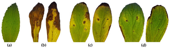 Symptoms of bacterial blight in borage plants ten days post-inoculation in (a) negative control plants; (b) positive control plants; (c) plants sprayed with COS–E. serrata conjugate complex at 187.5 μg∙mL−1; and (d) plants sprayed with COS–E. serrata conjugate complex at 375 μg∙mL−1.
