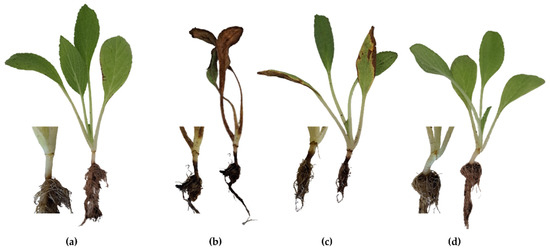 Symptoms of wilt, stem, and root rot produced by F. oxysporum in borage plants ten days post-inoculation in (a) negative control plants; (b) positive control plants; (c) plants treated with COS–E. serrata conjugate complex at 500 μg∙mL−1; and (d) plants treated with COS–E. serrata conjugate complex at 1000 μg∙mL−1.