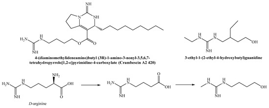 1-(4-hydroxybutyl)-2-methylguanidine acetate is the main component of Eucalyptus grandis W.Hill ex Maiden leaves [35] and has also been identified in the fresh extract of Cucumis sativus L. [36] and in fiddleheads (fern fronds) [37]. Its origin may be related to the hydrolysis of crambescin A2 (the specific constituent of Crambe abyssinica Hochst. ex R.E.Fr.), demethylation of 3-ethyl-1-(2-ethyl-4-hydroxybutyl)guanidine, or deamination of L-arginine (Figure 4).