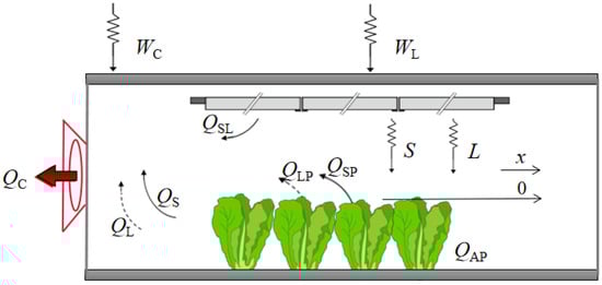 Plant factories are enclosed systems that rely on forced ventilation through air conditioning-fresh air systems. Crops grown inside building structures are isolated from mass heat exchange with the external environment due to insulated walls. Therefore, the microclimate of the crop canopy inside a plant factory is crucial in determining the quality of plant growth [,]. When constructing a model based on the interaction between the crop canopy and microclimate, it is important to treat the crop canopy as a closed, structurally homogeneous, and stable system. This enables a specific description of the crop canopy microclimate using meteorological data such as temperature, humidity, and wind speed. Environmental factors such as humidity, temperature, airflow, and light are coupled with the crop canopy [,]. During the light period, crops undergo photosynthetic physiological activities where water vapor from transpiration serves as the source of humidity in the crop canopy, and the LED light source is the only source of heat and light [,]. As shown in Figure 1, we established an energy balance equation for each environmental factor of the crop canopy microclimate. WL refers to the power consumption of the LED light source, while WC refers to the power consumption of other facilities such as air conditioning. The calculations of sensible heat and heat dissipation caused by LED heat dissipation are the basis for subsequent simulations.