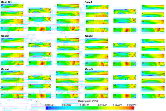 Figure 4 shows that the heat dissipation of LED lights has a significant impact on the humidity field of the plant factory, leading to notable variations under different working conditions. The results indicate that the humidity field of the plant varied significantly depending on the operational parameters. As shown in Figure 5, when the LED light source was turned on and the PPFD increased, the uniformity index of relative humidity in the plant factory decreased significantly. The relative humidity disturbance coefficient first decreased and then stabilized under the T4 treatment group (LEDS is 200 μmol/m2·s, LEDG is 300 μmol/m2·s) and T5 treatment group (LEDS is 250 μmol/m2·s, LEDG is 350 μmol/m2·s). The disturbance coefficient was 0.087 for the T4 treatment group and 0.093 for T5 treatment group.