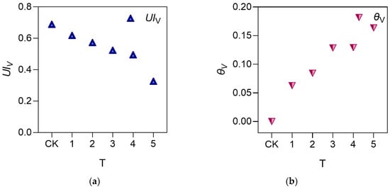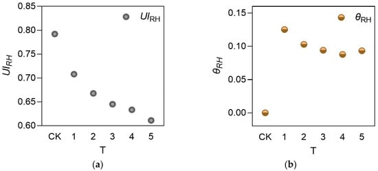 Relative humidity (RH): (a) uniformity index of relative humidity; (b) disturbance coefficient of relative humidity. T represents different treatment groups, same for the following.
