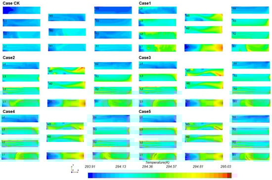 The impact of LED heat dissipation on the temperature field of plants under various operating conditions is illustrated in Figure 8. As shown in Figure 9, as the PPFD of the treatment group increases, the coefficients of temperature field non-uniformity and disturbance reach their extreme values in the T5 treatment group (LEDS is 250 μmol/m2·s, LEDG is 350 μmol/m2·s). The coefficient of uniformity decreased to 0.5354 while the coefficient of disturbance increased to 0.1533.