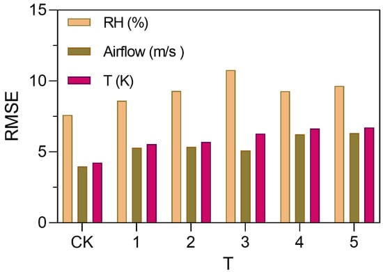 To verify the accuracy of the simulation models for humidity, airflow, and temperature environments used in this study, the mean square error (RMSE) was calculated by comparing the simulated values with actual measured values at monitoring points under each working condition. As shown in Figure 10, the mean RMSE for the humidity field was 9.21, for the airflow field was 5.39, and for the temperature field was 5.86. Based on these RMSE values, the regression results of each model in this study are reliable and accurate.
