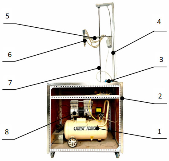 Impact damage testbed of fragrant pears. 1. Air compressor; 2. Engine body; 3. Vacuum generator; 4. Linear guideway; 5. Cantilever arm; 6. Sucker; 7. Leading screw; 8. Pneumatic motor.