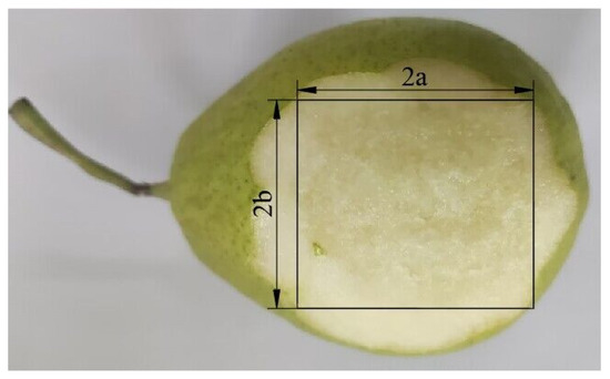The test data were recorded, and the mean results were used. After being damaged, the fragrant pears from Korla were left at room temperature until they turned brown. Using a knife, the pericarp was removed from the damaged areas. According to Wu et al. [24], the damaged shape of fruits is somewhat oval-like. The semi-major axis (a) and the semi-minor axis (b) of the damaged area were measured (Figure 2) in three repetitions, and the mean results were selected. The oval area was considered equal to the damaged area (Equation (1)). According to falling height, the corresponding damage areas were determined at 77.71 mm2, 296.91 mm2, 604.05 mm2, 900.77 mm2, 952.30 mm2, and 993.42 mm2, respectively.