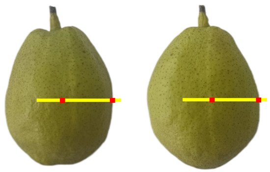 The SSC was measured using a portable sugar content measuring refractometer (B32T, Mingrui Electronic Technology Co., LTD., Guangzhou, Guangdong, China). The portable refractometer for sugar measurement must be calibrated before SSC measurement. Following this, 10 fragrant pears were chosen randomly for the test. During the test, four symmetric uniform points were chosen at the equator of the fragrant pears, and the measuring points are depicted in Figure 3. A scalpel was used to remove the pericarp, which was then manually squeezed. The squeezed juice was dropped at the deviation prism before being covered with the cover plate. SSC of fragrant pears was observed through an ocular lens. After each measurement, the deviation prism and cover plate were cleaned with clean water. The mean of the test results was used (unit: %). A total of 630 fragrant pears were needed to measure SSC.