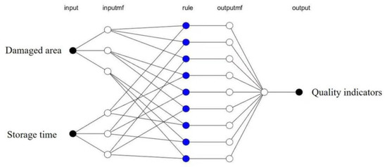 In this study, 70% of the test data was randomly selected as the training set, while the remaining 30% was selected as the test set. The Matlab tool cabinet was used for ANFIS modelling. The Matlab software version was R2017a (MathWorks, Natick, MA, USA). The system input considered damage area, and storage time and the system output considered quality indicators. Grid Partition was selected to create the basic fuzzy reasoning system once the training set was input. Eight types of input membership functions were used, including trimf, trapmf, gbellmf, gaussmf, gasuss2mf, pimf, psigmf, and dsigmf. The type of membership function has a direct impact on the output results of the prediction model and is crucial for predicting the quality of damaged fragrant pears. In the modelling training stage, the initial ANFIS models were produced by the meshing technique, and the models with different membership functions were used for the fuzzification of input data. The error tolerance and the times of iterations were set as 0 and 100, respectively. The test dataset was input into trained models with different membership functions to obtain the prediction value. In this study, the system structure of the quality prediction model of damaged fragrant pears is shown in Figure 4.