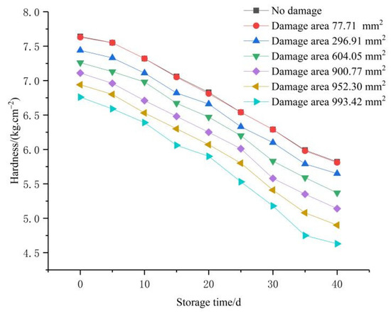 Hardness is one of the important measuring indexes of fruit commodities, and it is an essential index for recognising quality characteristics [28]. It is vital for fruit edibility, supply period, and commodity value. It can be seen from Figure 5 that the hardness of fragrant pears gradually decreases as storage time increases. Given the same storage time, the hardness of fragrant pears decreases with an increase in the degree of the damage. The average hardness of fragrant pears with different damage degrees decreased from 7.25 kg·cm−2 to 5.33 kg·cm−2 at 40 days. Fragrant pears have strong physiological activity in the storage environment under room temperature. The hydrolase causes the major components of the cell wall, such as cellulose and polysaccharides (including protopectin), to progressively decompose, causing damage to the cell’s organisational structure [29]. Therefore, the hardness changes of fragrant pears decrease gradually as storage time increases. Additionally, the degradation of polysaccharides in the cell wall of fruits requires the participation of carbohydrate enzymes. Mechanical damages may influence the activity of enzymes in fruit, thus increasing the activity of pectin methylesterase and polygalacturonase, accelerating the degradation of pectin and polysaccharide, and accelerating softening of fruits [30,31]. Therefore, the hardness of fruits is negatively related to the damage degree under the same storage time. During the storage period, no significant difference (p > 0.05) was found in the hardness of fragrant pears when the damaged area was 0 mm2, 77.71 mm2, and 296.91 mm2, while no significant difference (p > 0.05) was observed in the hardness of fragrant pears when the damaged area was 900.77 mm2, 952.30 mm2, and 993.42 mm2. However, a significant difference (p < 0.05) was noticed in the hardness of fragrant pears when the damaged area was less than 296.91 mm2 and greater than 900.77 mm2. When the damaged area is 77.71 mm2, there is no damage to the pericarp of fragrant pears and no visible damage, but there is mild damage in the pulp after peeling (Figure 6). During the storage period, the hardness variation laws of fruits are similar to those of non-damaged fragrant pears, indicating that low degrees of damage and the non-breakage of the pericarp slightly influence the physiological activity of fruits. When the damaged area is greater than 77.71 mm2, the higher damage degree significantly influences the physiological activity of fragrant pears.
