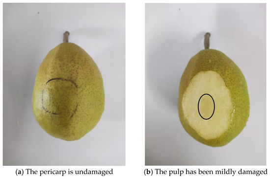 During practical production and processing, fruits are extremely susceptible to mechanical damage, thus influencing storage quality. There is a concern about whether storage quality can meet the industrial standards. Variation laws regarding the quality of damaged fruits during storage are a key concern of scholars. Shao [7] investigated the characteristics of storage quality of Citrus reticulate Blanco after extrusion damage and discovered that hardness, SSC, and titratable acid may show a declining trend if they suffer extrusion larger than 12 mm during storage, although the respiration intensity and ethanol and acetaldehyde contents may continuously increase, resulting in a decrease in quality. Pathare et al. [8] caused different degrees of impact damage to tomato fruits and stored them under 10 °C and 22 °C for 10 days. They found that damage area, weight loss ratio, total colour difference value, colour index, total soluble solids, and pigment content increased significantly with the increase in storage temperature and impact height. Although previous research has shown that damages have some influence on the storage quality of fruits, the effects of mechanical damages on the storage quality of Korla fragrant pears have yet to be explored. Some studies have pointed out that hardness and SSC are the most important internal quality attributes of fruits such as pears and are often used as major indexes to evaluate fruit quality [9,10]. Yu et al. [11] analysed the quality changes in pears during storage and found that hardness and SSC decreased continuously. Yu et al. [12] found that SSC was the key quality parameter of Korla pear. Chen et al. [13] studied the changes in physical and chemical properties of fragrant pear during storage and discovered that, after three months of storage, flesh hardness decreased and SSC increased continuously. Therefore, key attention shall be paid to influencing laws of mechanical damages on hardness and SSC of storage quality of fragrant pears. Furthermore, scientifically proven ways must be used to estimate the internal quality of damaged fragrant pears during storage.