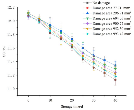 SSC is an important sensory quality of fruits and an essential index that reflects the internal quality of Korla fragrant pears [32]. The SSC of Korla fragrant pears determines the degree of sweet and brittle taste. The higher the SSC, the sweeter the taste of fragrant pears. It can be seen from Figure 7 that the SSC of fragrant pears decreases gradually with increasing storage time. Given the same storage time, the SSC of fragrant pears declines gradually as the degree of damage increases. The average SSC of fragrant pears with different damage degrees decreased from 12.10% to 11.25% at 40 days. The reasons for this can be described as follows: there is exuberant cellular respiration of fragrant pears in the storage environment at room temperature, and aerobic respiration may consume internal organic matter, such as glucose in fruits, thus decreasing SSC with the increase in storage time [33]. After mechanical damage to fruits, nutrients are consumed with the rise in respiration rate, resulting in a significant decrease in SSC. Under this circumstance, nutrients from surrounding perfect tissues will be supplied to the damaged position quickly, increasing nutrients at the site of damage and strengthening self-repair ability [34]. The respiration intensity of fruits is positively related to the degree of damage. Therefore, the SSC of fragrant pears decreases with increasing degrees of damage when the storage time is fixed. When the storage time is less than 25 days, there is no significant difference (p > 0.05) in SSC, regardless of the damaged area. When the storage time exceeds 30 days, there is no significant difference (p > 0.05) in the SSC of fragrant pears when the damaged area is less than 296.91 mm2 and when the damaged area is greater than 900.77 mm2. However, there is a significant difference (p < 0.05) in the SSC of fragrant pears when the damaged area is less than 296.91 mm2 and when it is greater than 900.77 mm2. Thus, the SSC of fragrant pears with different damage degrees is significantly affected by extending the storage time. When the damaged area of fragrant pears is 77.71 mm2, the variation laws of the SSC of damaged fruits during storage are similar to those of undamaged fruits. This supports the notion that, when the damage degree is low and the pericarp is not broken, the respiration intensity of fruits is slightly influenced. When the damaged area is greater than 77.71 mm2, the respiration intensity of fruits is influenced more by the increase in damage degree.