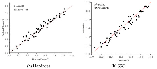 Scatter plots of the measured values versus the predicted values for hardness (a) and SSC (b).