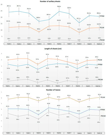 Throughout the ten years of culture, the data obtained for all proliferation parameters showed an acceptable homogeneity during incubation in PPRM, PELM, and PROM media, with the exception of the 4th and 8th years, in which all the cultures and parameters, and in particular the number of axillary shoots promoted in PPRM and PELM, decreased significantly for unknown reasons. Figure 1 shows the results (number of axillary shoots, length of axillary shoots, and number of leaves) obtained throughout the long-term micropropagation.