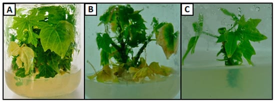 Throughout the long-term assays, some chlorosis problems of unknown origin were detected in the leaves of the papaya when incubated in the PPRM medium (Figure 4).