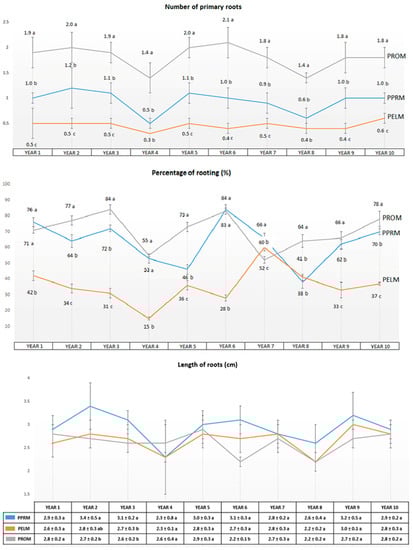 The rooting percentage in PPRM fluctuated over time between 38% and 84%, with the lowest values corresponding to the years in which the general growth and development was poor (years 4 and 8). On average, 63.1% of the shoots developed roots (Figure 3). In the case of PELM, the rooting ranged from 15% to 60% and on average 35.7% of shoots rooted. In the PROM medium, the rooting rate ranged from 52% to 84%, with an average 70.3% success rate. In general, the root induction and development was better in the PROM medium but the values corresponding to PPRM were also good enough to compete with those obtained using PROM.