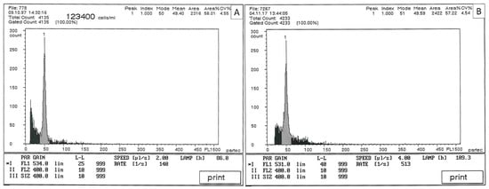 Flow cytometry traces for: (A) Carica papaya cv. “Solo” used as mother plant (2n = 2x = 18) and (B) micropropagated papaya after 120 subcultures (2n = 2x = 18).
