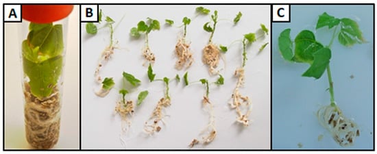 Rooting results for papaya shoots over a physical support of expanded vermiculite with liquid MS medium supplemented with 1 mg L−1 IBA: (A) test tube with rooted papaya shoot, (B) papaya plantlets obtained from test tubes, and (C) detail of a papaya plantlet rooted in expanded vermiculite.