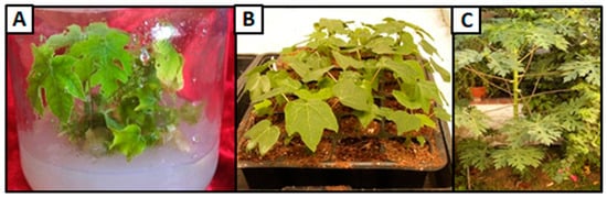 Micropropagation by tissue culture offers advantages over conventional propagation methods and has been widely applied to papaya species. Different approaches have been followed, such as axillary shoot culture [5,6,7,8] and plantlet recovery after shoot regeneration from somatic embryos [9,10,11,12,13,14,15,16]. This regeneration and plant recovery often occurs after genetic transformation procedures in this species [11,17,18,19,20,21,22,23,24], and it highlights the importance of developing reliable methods of preservation for long periods of time in order to finally obtain high-quality plants from selected lines of genetically modified papaya.