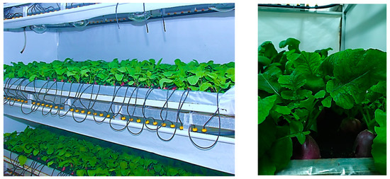 A total of 118 accessions of small radish and radish from the collection of the N. I. Vavilov All-Russian Institute of Plant Genetic Resources (VIR) and Russian breeding seed company were evaluated in order to search and select sources of breeding valuable traits under conditions of light culture (Table S1, Supplementary Materials). The studies were carried out under controlled conditions of the agrobiopolygon of the Agrophysical Research Institute (AFI) (St. Petersburg, Russia). Plants were grown in a thin layer of organo-mineral substrate on the original layered vegetation and irradiation equipment with an area of one layer of 3 m2 (Figure 1) [40]. Illumination in the experiment was 20–25 klx, photoperiod 12 h, temperature 24 ± 2 °C during the day and 18 ± 2 °C at night. The light source was high-pressure sodium lamps DNaZ-400 (“Reflax” LLC, Moscow, Russia). Accessions of R. sativus were sown with dry seeds in a growing medium based on high-moor peat (manufacturer–LLC Pindstrup, Russia) with the addition of Cambrian clay and chalk [41], substrate pH 6.0–6.2. The thickness of the root layer was 3–4 cm, the sowing scheme for small radish was 10 × 5 cm, and for daikon 12 × 10 cm. Watering was carried out daily: with water, alternating with fertilizing (Knop’s solution with the addition of ammonium nitrate 0.2 g/liter) 3 times a week. The harvesting of small radish plants was carried out on the 21st–30th day from sowing, and daikon on 25th–45th day from sowing. Three replicates and five plants per replicate for each accession were used.