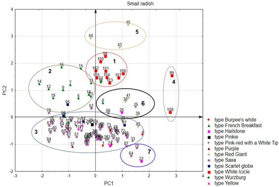 The accessions of the third group were characterized by a large variability in the combination of the studied features and formed a rather large and sparse cloud in the factor space. This group includes accessions of the Saxa type (47 acc.), Burpee’s White (4 acc.), Pink-Red with a White Tip (12 acc.), Scarlet Globe (3 acc.), Würzburg (2 acc.), Yellow (2 acc.), French Breakfast (1 acc.), Hailstone (1 acc.), Pinkie (1 acc.), Purple (1 acc.), and Red Giant (1 acc.).