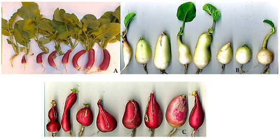 Differences in the size and shape of the root in the small radish cultivars under conditions of artificial light culture. Cultivars: (A) ‘Pernot’, (B) ‘Mohovskoy’, (C) ‘Pharaon’.