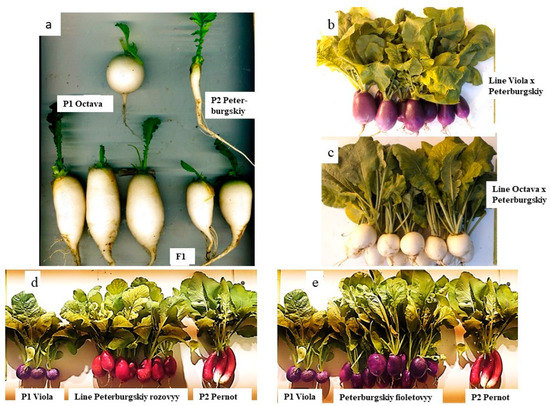 The use in this experiment of cultivars with a difference in root color (white, red, purple) as parental forms allowed us to obtain diversity for this trait in the created accessions. It is known that flavonoids are the major pigments responsible for the color of R. sativus. Pelargonidin-based anthocyanins (callistephin and pelargonin) are mainly found in red radishes, and acylated cyanidin and its derivatives have been identified in purple ones [37,61]. It has been shown that, when radish cultivars with purple and red roots are crossed, the color of edible root is usually inherited as a monohybrid inheritance with the purple color dominating [53,62]. Our results support this conclusion. When purple (cv. Viola) and red (cv. Pernot) small radish were crossed, F1 hybrids had the purple roots. The segregation by the root color in the F2 corresponded to 3 (purple): 1 (red) (p < 0.05, χ2 = 0.008). Accordingly, in F2, the ancestors of the purple and red lines were selected. These plants were transgressive in terms of root weight (Figure 4d,e). In crossing combination Viola × Peterburgskiy, F1 hybrids also had purple roots. In their F2 segregated population, the dark purple plant transgressive by root weight was selected as an ancestor, and based on it, a line with purple roots was obtained (Figure 4b). In crossing combination Octava × Peterburgskiy, all the hybrids (F1–F7) were white (Figure 4a,c).