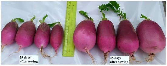 It is well known that various environmental factors can cause the formation of defects in radish roots, negatively affecting their commercial qualities. Abiotic factors, such as lack of moisture, temperature fluctuations, the quality of the growing medium, nutrient imbalance, plant density, and harvesting time cause a violation of the metabolic activity of root tissues, which leads to the formation of nonmarketable root deformation, cracking, hollowness, pithiness, branching, premature bolting, etc. In this regard, Manzoor et al. [48] conclude that, in order to obtain a high-quality crop, it is necessary to correctly select specific cultivars for specific conditions in order to minimize the manifestation of these disorders.