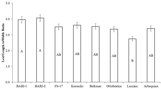 Leaf length to leaf width ratio of various olive cultivars (Different superscripts indicate significant differences by the ANOVA, followed by the Duncan test at p ≤ 0.05).
