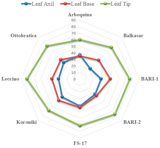 Olive trees have opposite leaves, typically from narrowly elliptic to linear-lanceolate in shape of a subdued green on the abaxial surface and whitish grey with a thick covering of small stellate hairs on the abaxial surface. The leaf base of most (four) of the olive cultivars i.e., Arbequina, Balkasar, Leccino, and FS-17, were cuneate with acute, rounded, apiculate, and cuspidate leaf tips, respectively (Table 1). Two out of the remaining four cultivars (Bari Zaitoon-2 and Ottobratica) showed acute leaf base shapes with acute and cuspidate leaf tips, respectively. The other two cultivars (Bari Zaitoon-1 and Koroneiki) had equilateral leaf bases with acute leaf tips (Figure 5).