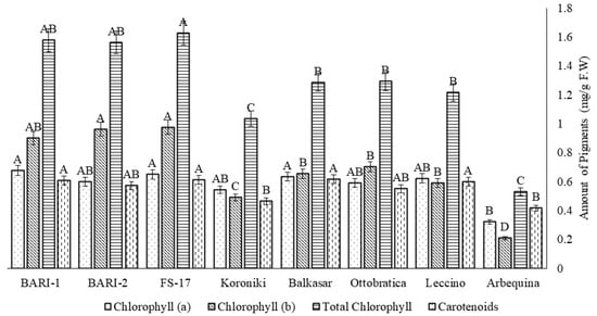 Fresh leaves of each cultivar (0.5 g) were chopped into segments of 0.5 cm and extracted with 5 mL acetone (80%) at 10 °C overnight. The material was centrifuged at 14,000 rpm for 5 min and the absorbance of the supernatant was measured at 645, 652, 663, and 480 nm using a spectrophotometer. Chlorophyll a, b and total chlorophyll along with carotenoids was measured as described by [42,43].