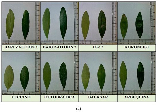 Ten fully expanded leaves of the same age from each olive cultivar were randomly collected. Leaf length was measured from extreme points, while width was measured from three different positions to obtain the average value for an individual leaf. The maximum leaf length and width were measured using a standard “cm scale” ruler. The leaf area from ten randomly selected leaves for each cultivar was estimated using a leaf area meter (AM-300) manufactured by ADC® Bioscientific Limited (Hoddesdon, UK), Opti-Sciences, Inc. (Hudson, NH, USA) [40]. The average values for the leaf area were expressed in square centimeters.