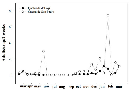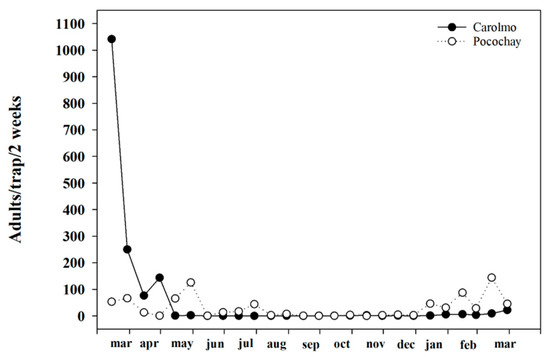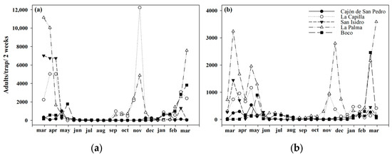 The largest adult populations of Trialeurodes vaporariorum captured in the yellow traps were found in areas producing tomato greenhouses. During the months of April and November, we recorded an average of more than 10,000 individuals captured inside the greenhouses (Figure 1a). The adult population of insects outside the greenhouses was higher in the months of March to May (Figure 1b). Productive areas without the presence of greenhouses also had whitefly populations, although in a lower proportion, and their increases were mainly due to the presence of tomatoes outside (Figure 2). Finally, it was observed that, in non-productive areas with a large amount of native vegetation, the whitefly population was almost nil due to the distance from the tomato production areas, the geographical position, and the scarcity of hosts (Figure 3).