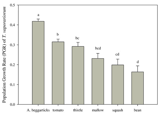 Performance expressed as the population growth rate (PGR, mean ± standard error) of Trialeurodes vaporariorum from 15 replicates for the different host species. Letters indicate significant differences based on a multiple comparison Tukey HSD. Thistle = Sonchus oleraceus; tomato = Solanum lycopersicum; bean = Phaseolus vulgaris; mallow = Malva sylvestris; Arizona beggarticks = Bidens aurea; squash = Cucurbita maxima.