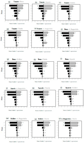 Paired choice tests with 15 paired combinations of host plants for Trialeurodes vaporariorum and the preferences of the insects at 1, 2, 3, 6, 12, and 24 h (Table A2). A multivariate Wilk’s Lambda test was used to determine significant differences, and a Bonferroni adjustment was used to test multiple comparisons. Letters show significant differences among hours, and an asterisk (*) indicates significant differences between host plants. Thistle = Sonchus oleraceus; tomato = Solanum lycopersicum; bean = Phaseolus vulgaris; mallow = Malva sylvestris; Arizona beggarticks = Bidens aurea; squash = Cucurbita maxima.