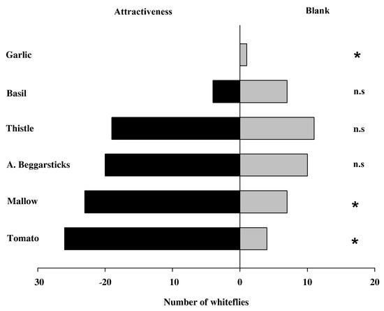 For the olfactometer tests, Allium sativum (garlic) and Ocimum basilicum (basil) were also used, as they have been widely studied as whitefly repellents [44]. These plants were included as a negative control.
