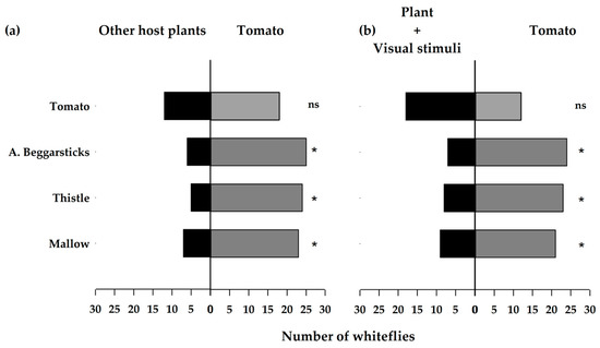 Number of greenhouse whiteflies Trialeurodes vaporariorum in Y olfactometric assays contrasting (a) other host plants against tomato; (b) other host plants + visual stimuli (yellow color) against tomatoes. * indicates significant differences with an X2 test; n.s., no significant differences.