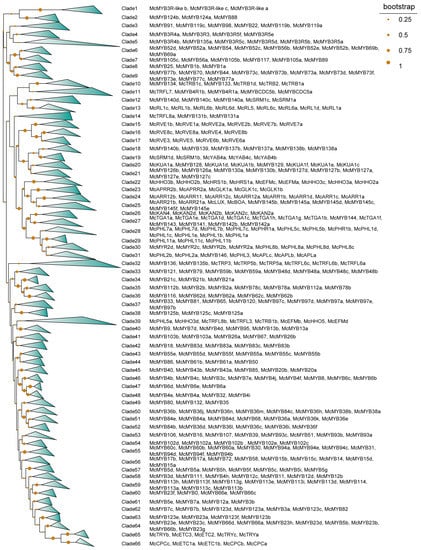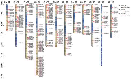 By using the HMMER search and domain analysis, a total of 421 MYBs were finally identified. After alignment by ClustalW, the conserved protein sequences of MYBs and the coding protein sequences were used to construct the phylogenetic analysis. Via phylogenetic analysis, we obtained 66 clades for all the MYBs (Figure 1). Combining with the BLASTp result with the genome of Arabidopsis, we categorized these 421 MYBs into 10 types, including R2R3, R-R, CPC-like, CCA1-like, TBP-like, R1R2R3, I-box, atypical MYB, MYB-CC, and MYB-like (outer layer color bands) (Figure S1). A total of 66 clades were identified among them, of which the R2R3 type alone occupied 56.1% (37 out of 66) (Figure 1). A close evolutionary relationship was found between the R-R and I-box MYBs, as well as the atypical MYBs and TBP-like MYBs. Both MYB-like and CCA1-like MYBs were divided into two groups. All R1R2R3 MYBs and CPC-like MYBs have developed a relatively close evolutionary relationship with their R2R3-type counterparts. It was observed that most members of MYB-CC and MYB-like members were evolving in close relation, indicating high similarity of the protein sequence between these two types of MYBs. MYBs with similar functions are likely to be located in the same sub-groups based on the topology of their phylogenetic trees [15], and vice versa. For example, McMYB3R-like a, b, and c were clustered in clade 1 and McMYB124a, McMYB124b, and McMYB88 were clustered in clade 2 (Figure 1), indicating that these genes have similar protein sequences within their corresponding clade, which potentially leads to functional similarities among them. McMYB124a, McMYB124b, and McMYB88 were distinguished from other members of R2R3 and clustered into one clade, suggesting these dissimilarities may be reflected in biological functions compared with other R2R3 members (Figure S1). However, whether this rule can reflect the similar or different functions of genes requires further validation through in vivo experiments, such as gene knockout or silencing. We also detected the distribution of the identified MYBs in chromosomes. Other than McMYB6a, McMYB140c, and McMYB140d, which were distributed across three separated scaffolds, the remaining 418 MYBs were distributed unevenly across 12 chromosomes (Figure 2). Among all the chromosomes, Chr04 had the longest length and carried 18.1% (76 out of 421) of all MYBs. In contrast, two chromosomes, Chr08 and Chr11, carried only 3.8% (16 out of 421) of MYBs and were the least distributed chromosomes in M. candidum (Figure 2). So, there was no correlation between the length of the chromosome and the distribution of MYB genes on the chromosome.
