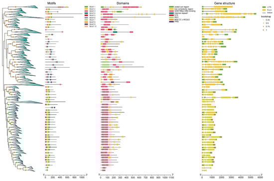 Motif, domain, and gene structure analysis of MYBs. Triangles on phylogeny trees mean highly similar MYBs within the clades.