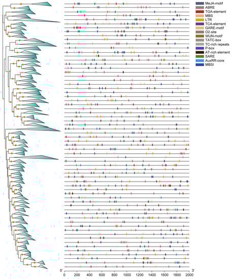 Promoter analysis of MYBs. Different triangles on the branches of phylogeny trees represent similar genes of one clade. Different colors on black lines represent different elements of the promoters.