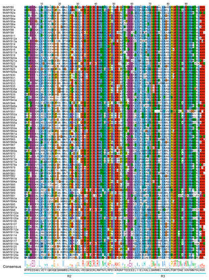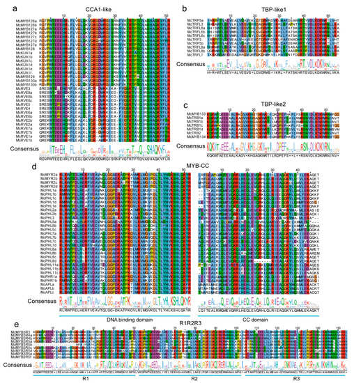Based on domain analysis, we confirmed the final MYB members and then conducted conservation analyses for each type of MYB TF. A total of 90 R2R3 TFs from phylogenetic trees were chosen to perform the alignment of protein sequences by the ClustalW method. The conserved region was confirmed to contain two adjacent regions, named R2 and R3, ranging from 1 amino acid (aa) to 50 aa and 54 aa to 105 aa positions, respectively (Figure 5). In both regions, a higher conservation level was found in the back parts than in the front parts (Figure 5), suggesting that there exist functional differences among R2R3 family members. For CCA1-like, CPC-like, and I-box TFs, there is only one SANT/DNA-binding domain with an approximate length of 50 aa (Figure 6a,g,h). At the 40–51 aa position, all 31 identified CCA1-like MYBs were highly conservative, and we also observed that the 31 TFs could be categorized into two groups based on their domains, one consisting of 17 members and another consisting of 14 members (Figure 6a), indicating the functional differentiation within the members of the CCA1 sub-family. Compared with CCA1-like MYBs, there was a much higher conservation level for CPC-like and I-box TFs within families, indicating that these TFs are functionally similar (Figure 6g,h). All TBP-like TFs also contained one SANT/DNA-binding domain with an approximate length of 55 aa. However, 10 TBP-like TFs contained the conserved domain at the beginning parts of their sequences, and the other 7 TBP-like TFs contained the conserved domain at the end part of their sequences. Additionally, there was a lack of conservatism between the two domains as well (Figure 6b,c). R1R2R3-type MYBs had three conservative SANTs/DNA-binding domains, namely R1, R2, and R3, with a length of 50 aa, 51 aa, and 51 aa, respectively. The nine identified MYBs had a higher conservative degree in the latter part of their protein sequences than in the front in each of the three domains (Figure 6e). Although R-R-type MYBs also contain two distant domains, they appear to be very different from the two domains of the R2R3 MYBs. A total of 17 identified MYBs were not conserved at the 20–29 aa position of the first domain, but highly conserved in the second domain. The conservative degree in the second R region was significantly higher than that in the first R region (Figure 6i). The atypical MYBs were composed of 3 types of MYBs, including McMYB3R-like, McMYB4R1, and McMYBCDC5 with more complex domains, and 3–5 SANTs/DNA-binding domains, so it was hard to find the conservative regions for them. Previous studies on MYB gene identification have often overlooked the MYB-CC and MYB-like sub-families in their analyses [2,50,51]. In this study, we identified 31 MYB-CC MYBs and 56 MYB-like MYBs. The MYB-CC TFs contain two conserved domains, one SANT/DNA-binding domain and another MYB-CC domain (Figure 6d). MYB-like MYBs contain an approximately 52-amino-acid domain. It is clear from the above that most MYB types have unique characteristics, which make them distinct from other types of MYBs.