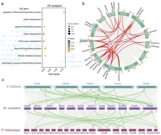 GO analysis and collinearity analysis of flower development and color-formation-related MYBs within genome and across genomes of different species. (a) GO analysis result of all identified MYBs. The yellow represents significantly enriched; the size of the pot represents enriched gene numbers. (b) Gene pairs of the selected 23 MYB genes. The red lines within the Circos graph display gene pair relationships. (c) Collinearity analysis of three different species. The green lines between different species display corresponding collinearity genes among three species.