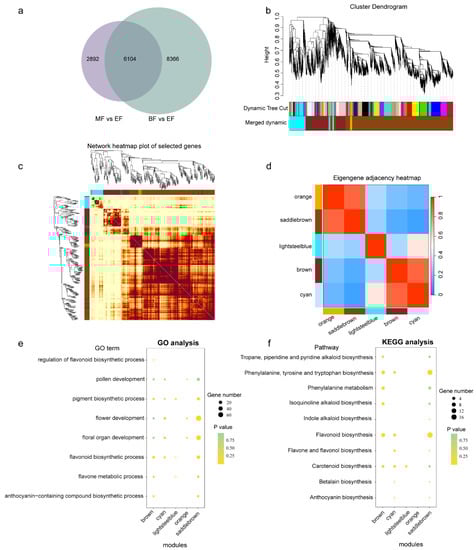 WGCNA analysis of differentially expressed genes at three developmental stages of flowers and GO and KEGG analyses of different modules. (a) Venn graph between two versus groups. EF: early-stage flowers; MF: middle-stage flowers; BF: blooming flowers. (b–d) Module division of the common differentially expressed genes. The modules were named according to their color; within (c), the dark color indicates high correlations, light color indicates low correlations among genes. (e) GO analysis of different modules. (f) KEGG analysis of different modules. In both (e,f), yellow represents significantly enriched. The size of the points represents the gene number.