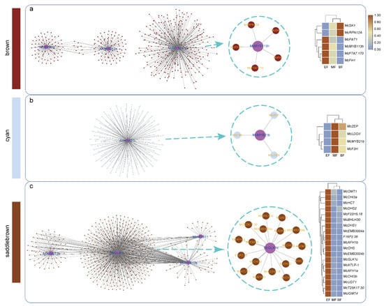 To explore the relationship between our selected MYBs and other functional genes, we constructed a co-expression network of the top 100,000 genes in the saddlebrown, brown, and cyan modules based on weight value (Figure 9a–c). We observed that in these modules, several DEGs had co-expression relationships with McMYB32, McMYB12e, and McMYB113h. Upon further investigation with flower-development-related functional genes, we found that McMYB113h displayed high co-expression relationships with McSK1, McRPN12A, McPAT1, McF7A7.170, and McFH1 in the brown module (Figure 9a). McSK1 and McRPN12A were up-regulated in the BF stage, while the rest of the genes in the co-expression network were up-regulated in the EF stage (Figure 9a). In the cyan module, we observed that McMYB21b had relatively high co-expression relationships with McF3H, McZEP, and McLDOX (Figure 9b). All genes in the subnetwork were up-regulated in the MF stage (Figure 9b). In the saddlebrown module, we found that McGLK1c had relatively high co-expression relationships with 18 functional genes and all genes in the subnetwork were up-regulated in EF stages (Figure 9c).