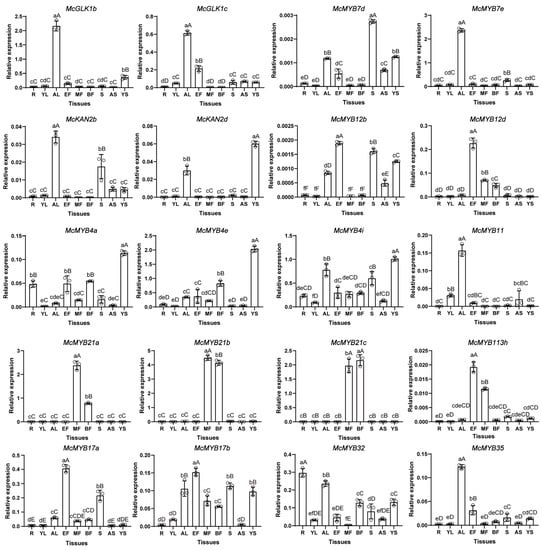 Analysis of expression of the selected MYB genes. YL: young leaves; AL: adult leaves; YS: young stems; AS: adult stems; S: seeds; R: roots; EF: early-stage flowers; MF: middle-stage flowers; BF: blooming flowers. Hollow circles in these graphs represent the relative expression of three biological repeats. The relative expression levels are shown as the mean ± SD. Duncan’s test was used to evaluate significant difference levels. Lowercase letters denote statistical significance at p ≤ 0.05; capital letters denote statistical significance at p ≤ 0.01.