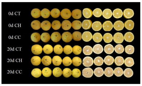 Morphology of citrus coated with CT, CH and CC before and after storage (CT, control experiment; CH, single chitosan coating group; CC, chitosan/CMC self-assembled LbL coating group.).